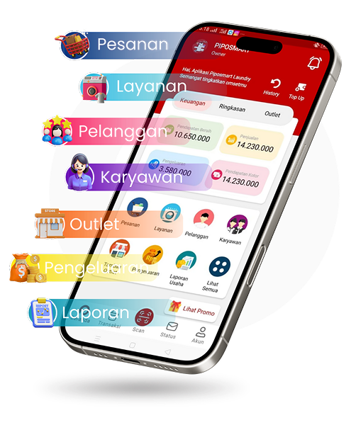 Laundry express lebih cepat dikelola dengan Piposmart, order langsung tercatat, status cucian bisa dipantau, pembayaran praktis, dan laporan selesai otomatis.