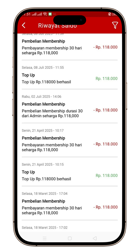 Semua aktivitas seperti top up dan pembelian membership tercatat otomatis dengan detail waktu dan nominal.